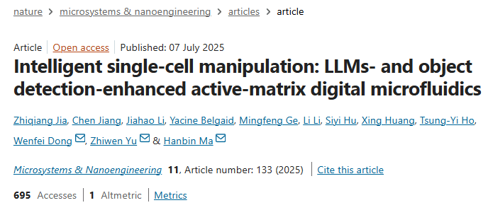 近日,人机物融合智能计算团队最新研究成果“Intelligent single-cell manipulation: LLMs- and object detection-enhanced active-matrix digital microfluidics”被Nature子刊《Microsystems and Nanoengineering》录用并在线发表。动画疯