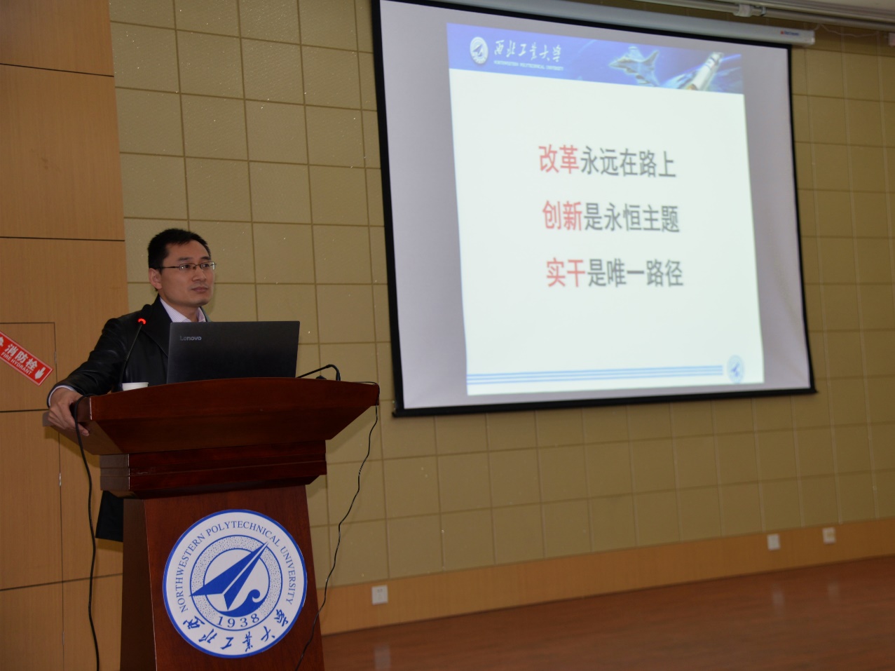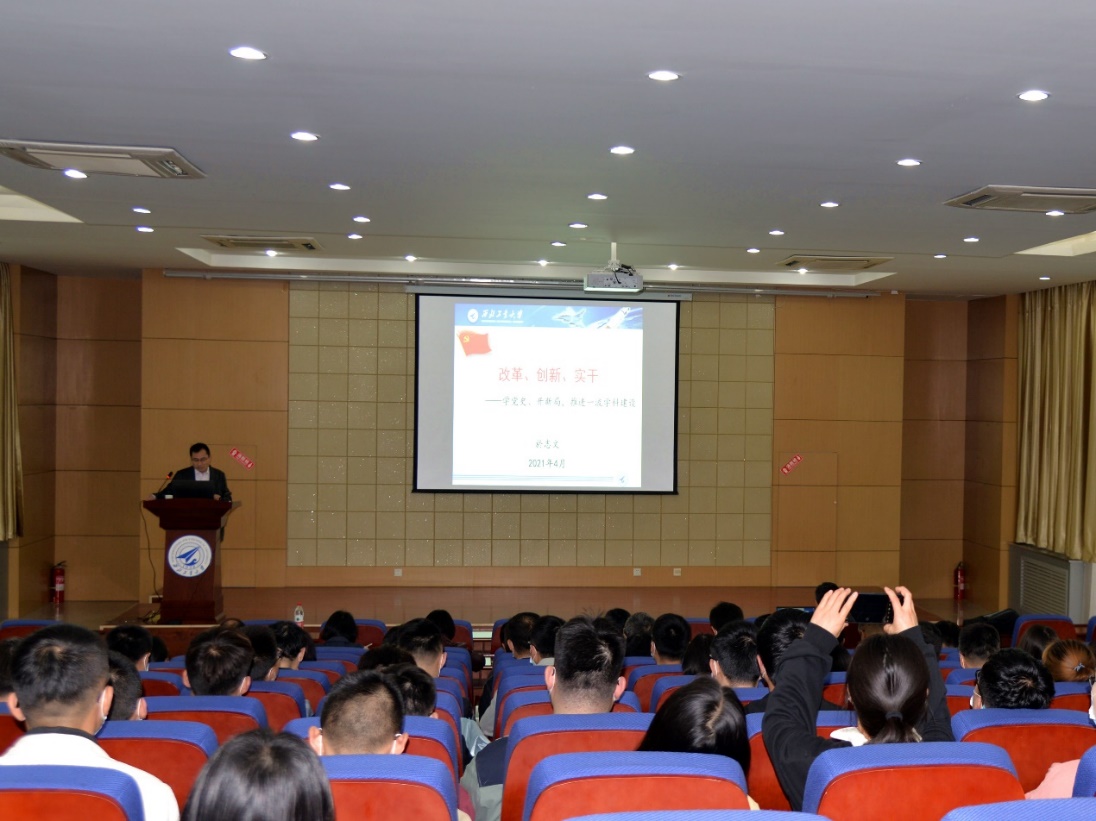 院长於志文为学院青年教师,讲题为《改革、创新、实干——学党史、开新局,推进一流学科建设》党课。党课由院长助理郭斌主持。