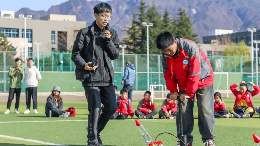 随后,航天科普志愿者服务队的同学们指导三高小学的同学们动手制作水火箭,并进行了发射实验。通过调整水的配比与发射角度,四枚“自制火箭”成功升空,现场掌声雷动。活动还特别设置了固体火箭模型讲解环节,结合动画疯