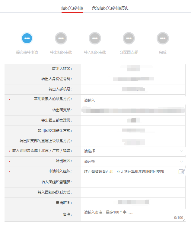 3.进入业务界面如实填写信息。申请转入组织一栏,若所在支部在系统中已有组织,可直接选择转入;若所在支部尚未建立组织或尚未明确所在支部,则转入临时支部并备注个人情况。(动画疯