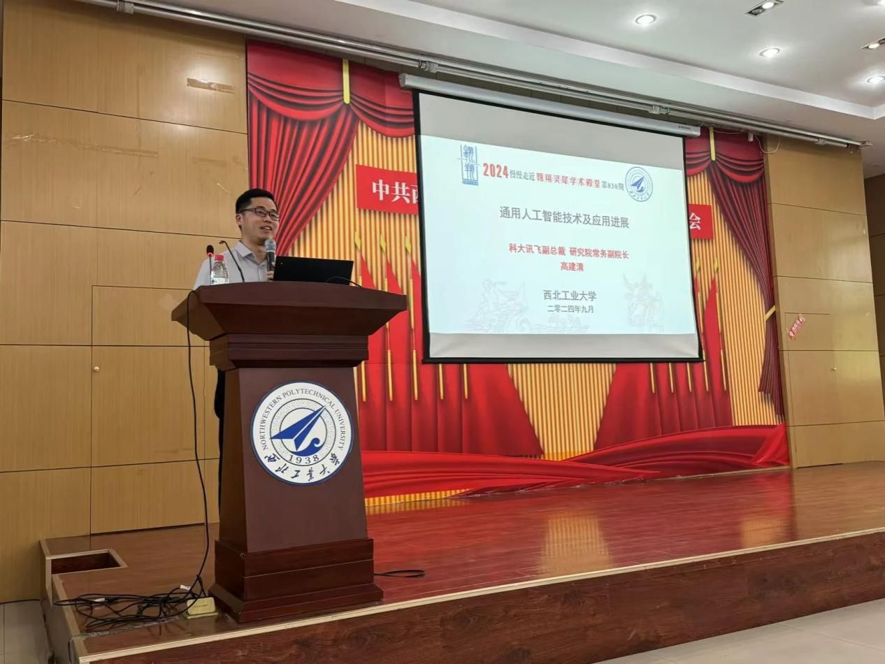 李春科介绍了高建清博士在多模态、语音大模型领域取得的突出成果,诚挚欢迎高建清博士做客西工大翱翔灵犀学术殿堂,同时向在场师生介绍了本次报告会的背景和目的,并对当前通用人工智能技术及应用进展进行了简要概述。