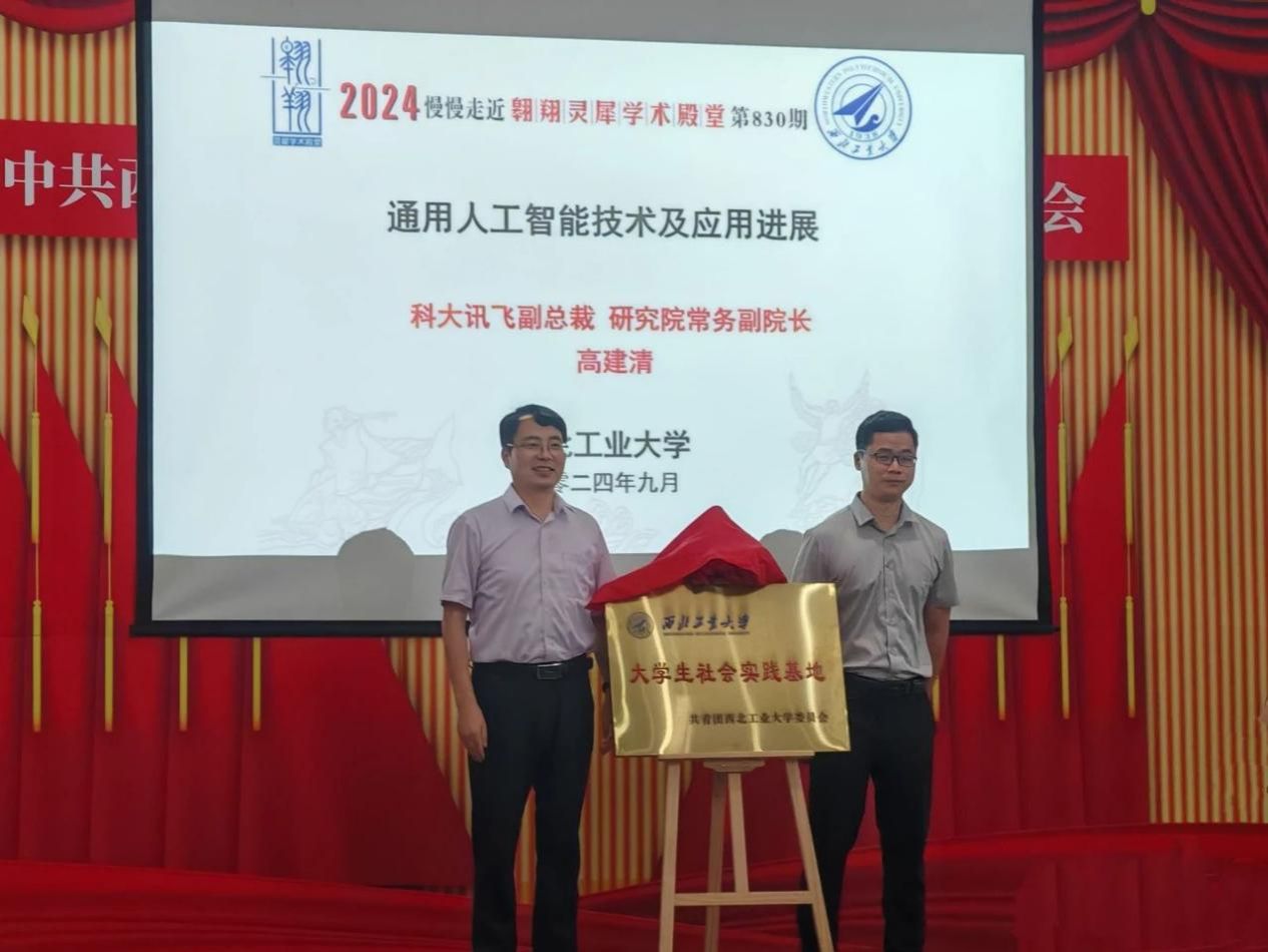 党委书记李春科共同为科大讯飞西工大大学生社会实践基地揭牌,进一步加深校企合作,携手打造人工智能拔尖人才培养高地。