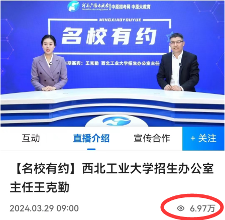 3月29日上午,招生办主任王克勤应邀参加了河南广播电视台“名校有约”栏目直播专访,为广大考生和家长深度解读了学校在豫的招生政策。此次直播受到了广泛关注,吸引了近7万名观众在线观看。