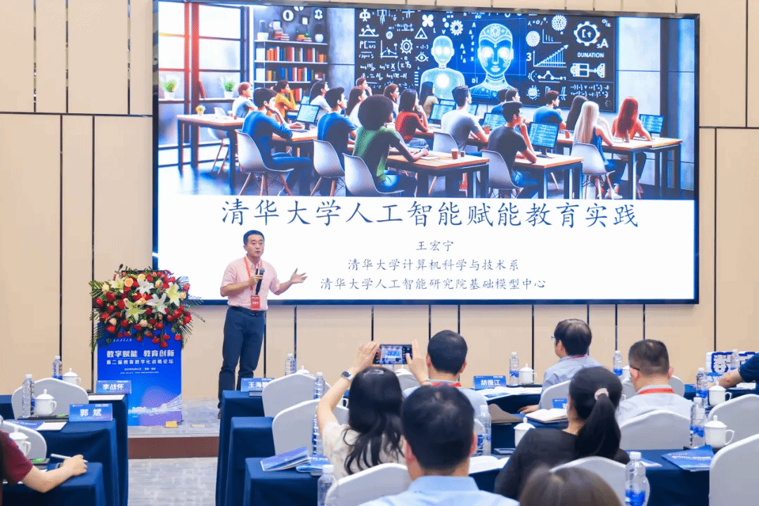 王宏宁以《清华大学人工智能赋能教育实践》为题,介绍了清华大学为促进学校信息技术与教育教学的深度融合而打造的“智能助教”,分析和展示智能助教的主要功能和助教系统开发的体会和经验。