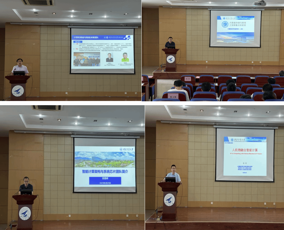 研究生招生宣讲会”,面向大三学生介绍学院的研究生培养体系。学院副院长夏勇教授、智能计算架构与系统芯片团队安建峰副教授、人机物融合智能计算团队张羽教授、大数据管理与分析团队陈伯林副教授、智能感知与媒体计算团队王鹏教授、系统测控仿真与信息存储团队龙江副教授、复杂软件系统团队张营副教授、计算机网络与机器人系统团队潘炜副教授等8位教师代表,以及2022级本科生参加会议,宣讲会由夏勇教授主持。