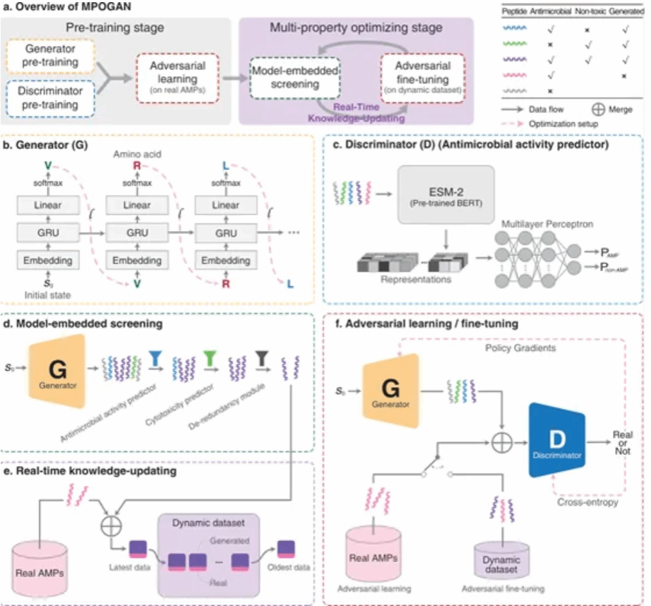 抗菌肽(AMP)是一类具有抗菌活性的小分子多肽药物,由于其广谱抗菌特性且不易诱导细菌产生耐药性,AMP成为应对全球细菌耐药性问题的重要研究方向。然而,AMP从头设计领域目前仍面临诸多挑战。实验室合成AMP的过程耗时且成本高昂;且抗菌肽不同属性之间可能存在冲突,使得现有计算方法难以同时优化多种目标特性(如抗菌活性、低毒性和序列多样性等)。为了解决这些挑战,该论文提出了面向抗菌肽多属性同步优化的生成对抗网络(MPOGAN)。通过设计嵌入式和串联式的属性评估器,筛选生成模型生成的高质量肽序列,并提出实时知识更新(RTKU)策略,动态更新训练数据集,从而迭代学习肽序列与多种治疗属性之间的关系,使生成模型逐渐具备生成具有多种优良属抗菌肽的能力。实验结果表明,MPOGAN在生成满足多种目标属性(高抗菌活性、低毒性和序列多样性)的抗菌肽方面优于现有方法。通过与动画疯