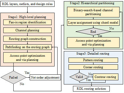 近年来,随着我国科技界对芯片领域“卡脖子”关键技术的攻坚,集成芯片和芯粒技术受到了前所未有的高度重视,而扇出型晶圆级封装(FOWLP)工艺因其高集成度、低功耗、高性能等优势,在高性能计算、人工智能等领域得到了广泛应用。该研究聚焦集成电路先进封装设计领域,针对FOWLP工艺下芯粒互连设计所面临的高密度布线冲突、通孔布局优化困难、寄生效应影响信号完整性等突出问题,提出了一种基于层级划分的重分配层布线设计流程,通过采用全局通道规划、接入点优化、线网层分配优化等策略,有效提高了布线效率,实现了高布通性、短线长、低干扰等目标,为解决高密度芯粒互连设计中的关键问题提供了新思路。