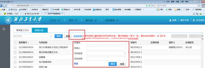 3.  在“案卷认领页面”点击“高级搜索”,然后根据“发明人”(或者“申请号、专利名称”)进行查询