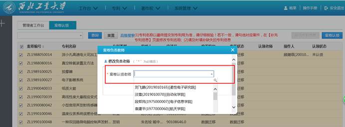 5.  在弹出的“案卷负责教师”框“案卷认领老师”模块通过教师姓名或工号进行搜索,然后将专利认领到该教师名下,然后点击保存