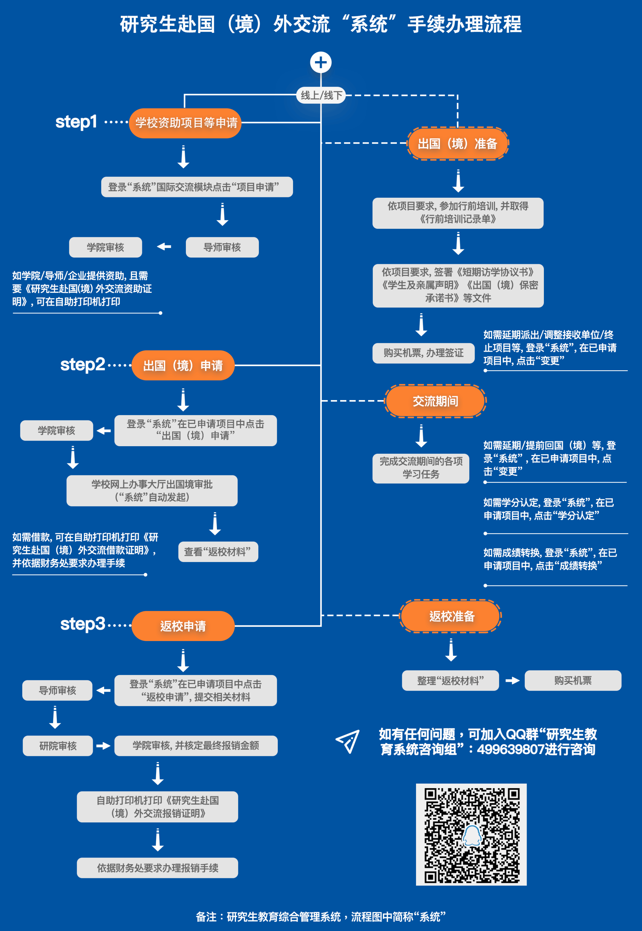2.所有研究生出国(境)均需通过研究生教育综合管理系统进行出国(境)申请、返校申请(Step2、3)。