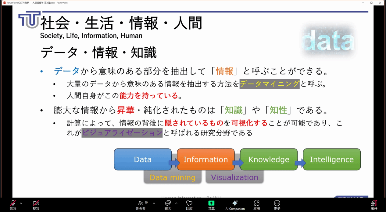 东京工科大学计算机科学部老师武博连续四年开设此课程,深受同学们喜爱,凭借其深厚的学术造诣,为同学们带来了一场精彩纷呈的学术盛宴。武博老师从人类与信息的关联入手,深入讲解了人类信息学的核心内涵、研究方向及其在社会各领域的应用,结合跨学科知识与实际案例,将这一复杂的学术领域阐释得清晰易懂。人们在探索过程中,围绕人类信息处理机制、人机交互设计和技术社会应用等话题展开深入思考,涌现出诸多独到见解。通过对人类信息学的了解,人们不仅系统掌握了其涉及的主要领域和应用逻辑,还在多学科知识的融合中拓宽了认知边界,为未来在信息技术与人类社会交叉领域的实践与研究奠定了坚实基础。